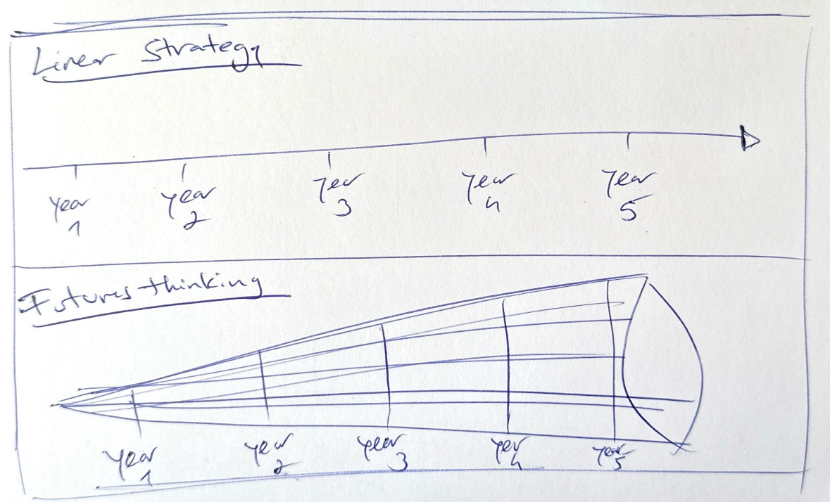 While five-year plans cling to the illusion of certainty: fixed milestones, neat predictions, rigid roadmaps. Futures thinking does the opposite. It trades false confidence for curiosity, linear forecasts for multiple possibilities.